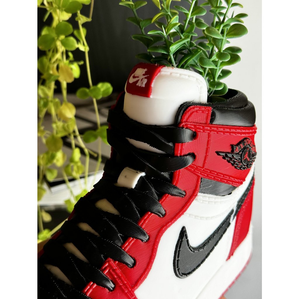 A sculptural sneaker planter modeled after the AJ1 Chicago layout. The PLA+ 3D-printed body preserves sharp edges and adds a refined layer-by-layer texture that reads premium both in person and on camera.