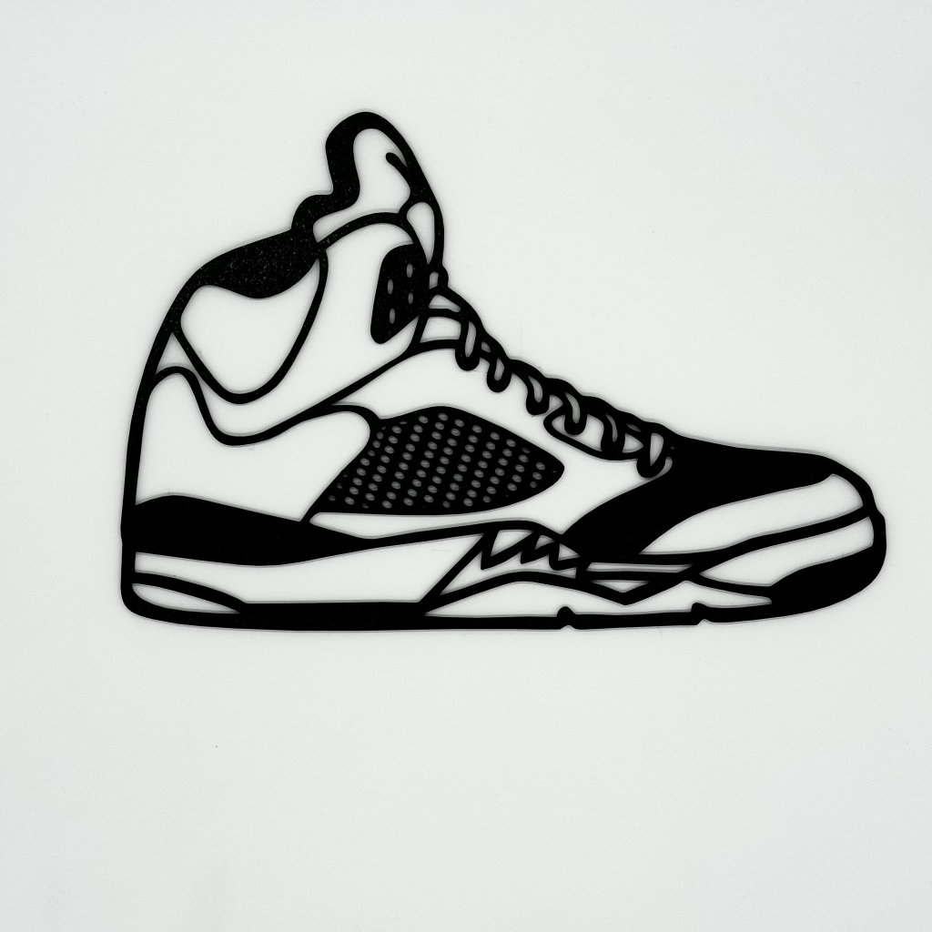A minimalist sneaker wall piece based on the AJ5 profile: angular toe, netted panels and that unmistakable midsole bite. Subtle enough for living rooms; bold enough to anchor a sneaker wall.