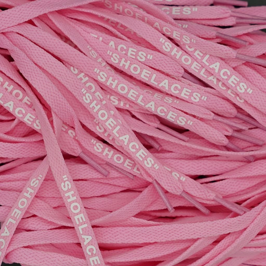 Pink Off-White flat shoelaces with the bold “SHOELACES” print. A playful and trendy replacement for Nike x Off-White, Air Jordan Off-White, and custom sneakers.