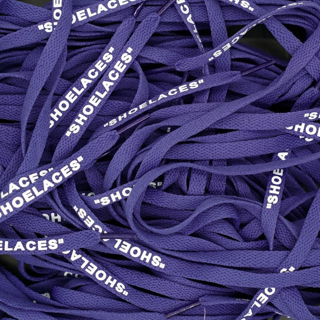 Purple Off-White flat shoelaces with the iconic “SHOELACES” print. A creative and bold replacement for Nike x Off-White, Air Jordan Off-White, and custom sneakers.