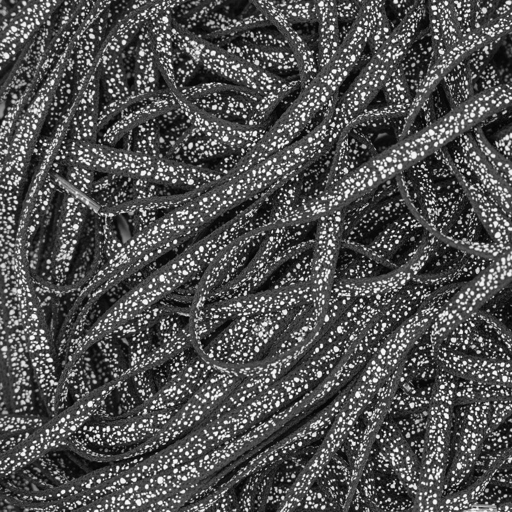 Čierne ploché šnúrky so speckle potlačou pre Air Jordan 4. 8 mm profil, kvalitný pletený povrch, pevné zakončenia. Ideálne na “Cement/Oreo/Black” farebné kombinácie.